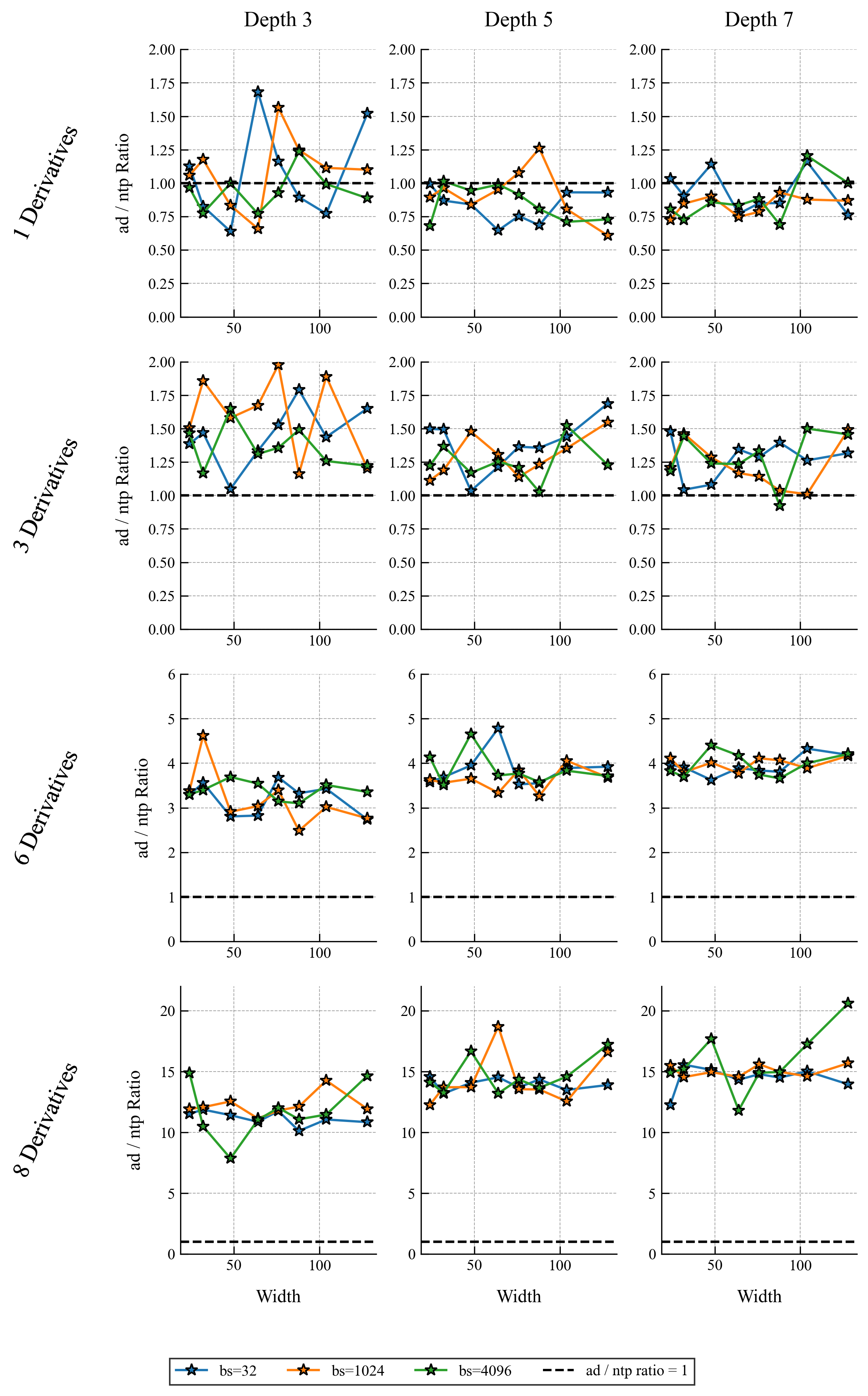 This root-exponential dependence on cannot be avoided by any differentiation algorithm, it is an unavoidable consequence of differentiation through function composition, which necessarily requires Faà di Bruno’s formula. Note than the the more exact runtimes for autodiff and -TangentProp are