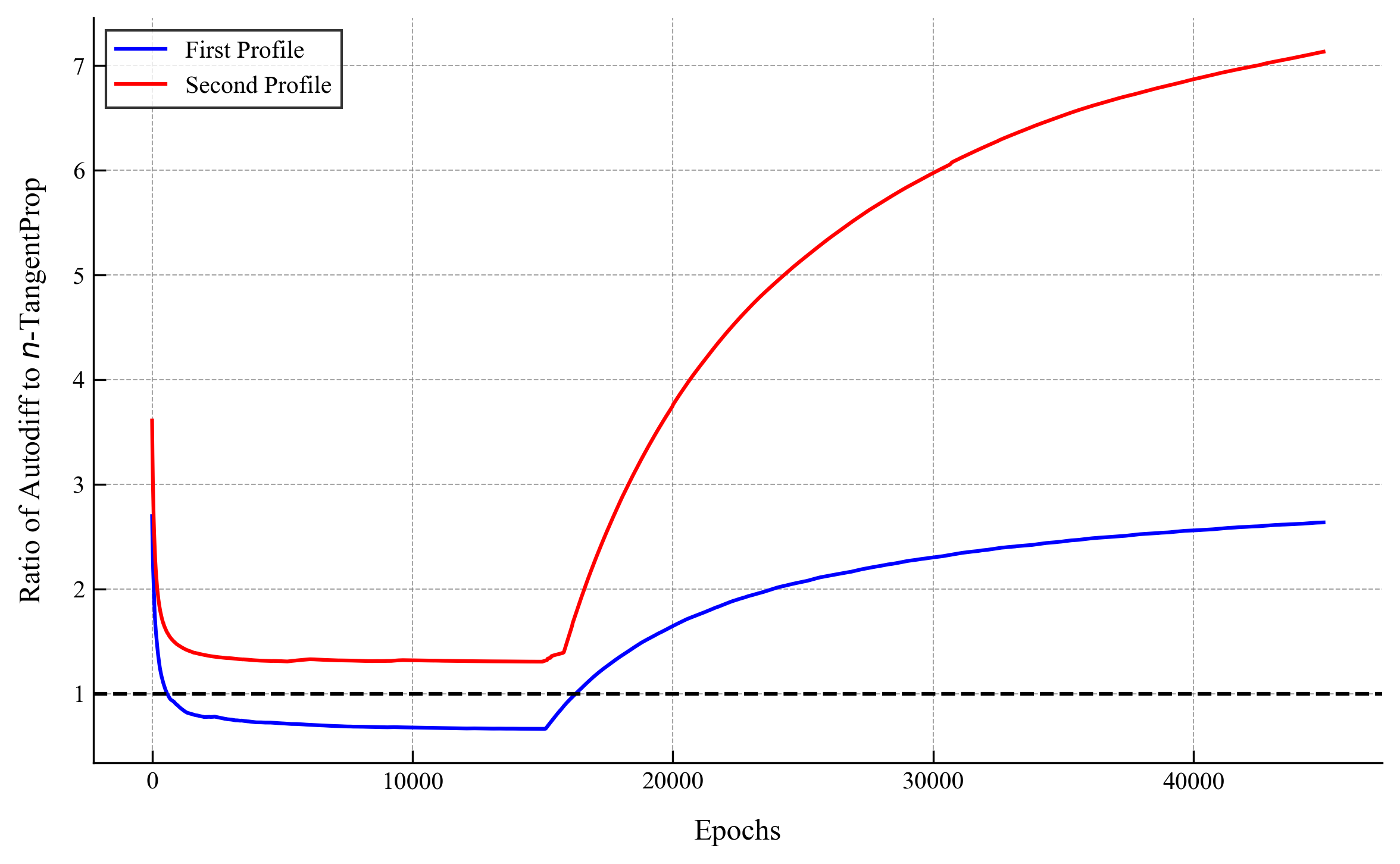We only computed the first two profiles using autodiff. The reason is that already for computing the third profile using autodiff we needed more than 24 hours of compute time on an A6000 GPU, which went beyond our allowable compute budget. With -TangentProp this profile took a little under 1 hour, meaning that we had a speed up of over 24x. For the fourth profile we estimate that autodiff would take about 100 hours (around four days), and we were able to compute it on our computer in under an hour and a half, giving more than a 65x speed-up! Keep in mind that we only implemented minor optimizations for our code.