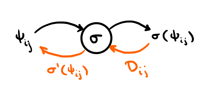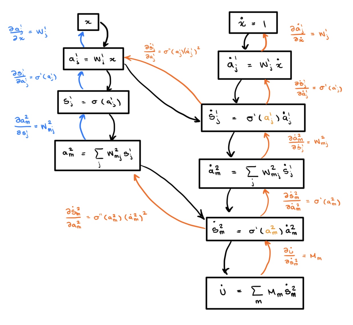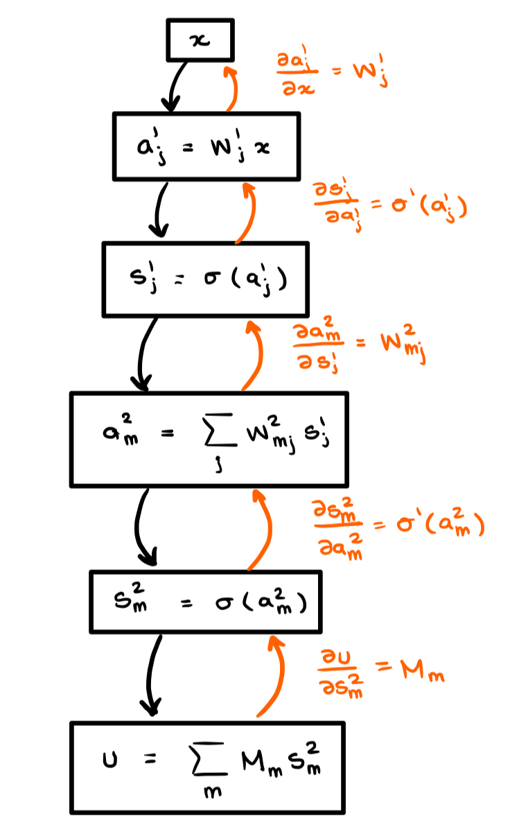 Where is the Hadamard (element-wise) product and is the standard dot-product. This same sequence of operations can be computed by following the orange lines up through the computational graph on the right. And here is the key: Doing this generates a new computational graph for the derivative! If we draw this new graph and it is immediately apparent that the functional composition introduces a new dependency which makes it so that we can no longer draw the graph as a simple “line” of nodes: