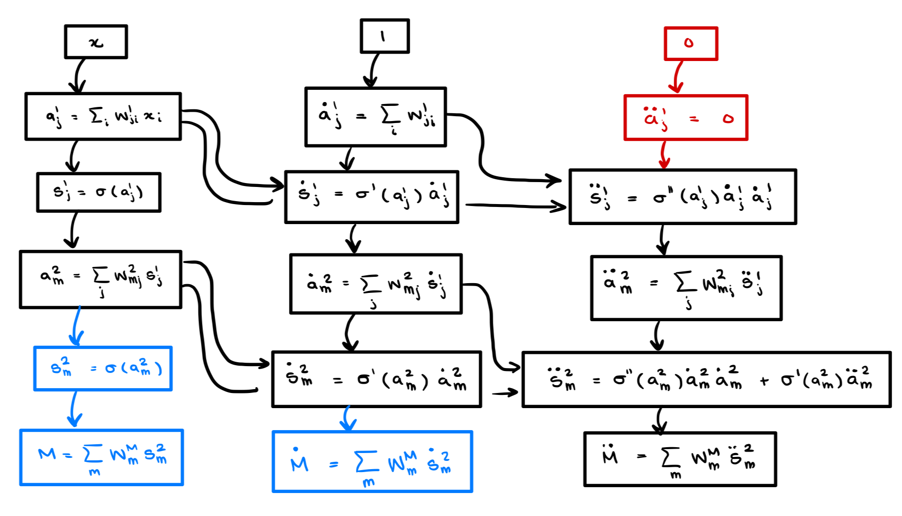 On the left is the computational graph for the first derivative, and to the right is the computational graph with the derivatives included. We note an important property, when we go to create the computational graph corresponding to the second derivative, the edges in blue will be computed twice, since they were already computed when we computed the forward pass for the zeroth derivative (our original graph). Note that this forward pass is required due to the nonlinear functional composition with : we need to compute the activations and to compute the derivative .