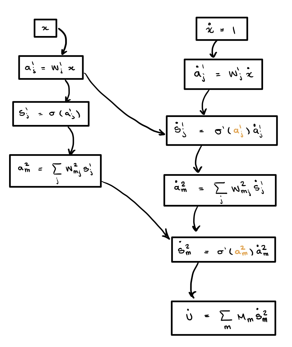 We base our work off the TangentProp formalism introduced by Simard et al. in 1991. Written before the widespread adoption of autodiff in training neural networks, they propose a formalism for computing both and in a single forward pass. Rather than compute and evaluate the computation graphs using autograd, we can explicitly form a single computational graph since we know the explicit dependencies between derivatives. In particular, the activation at layer is given by