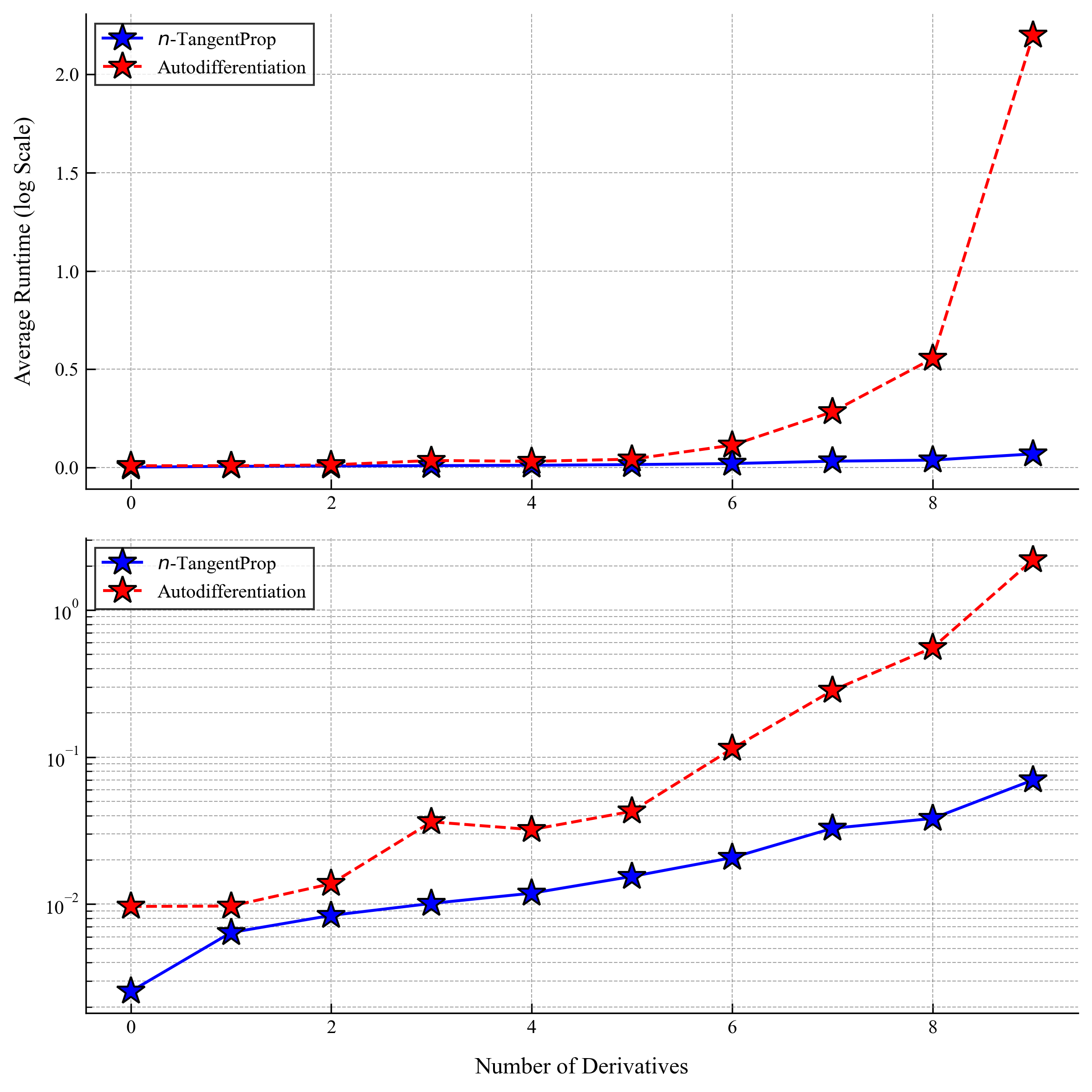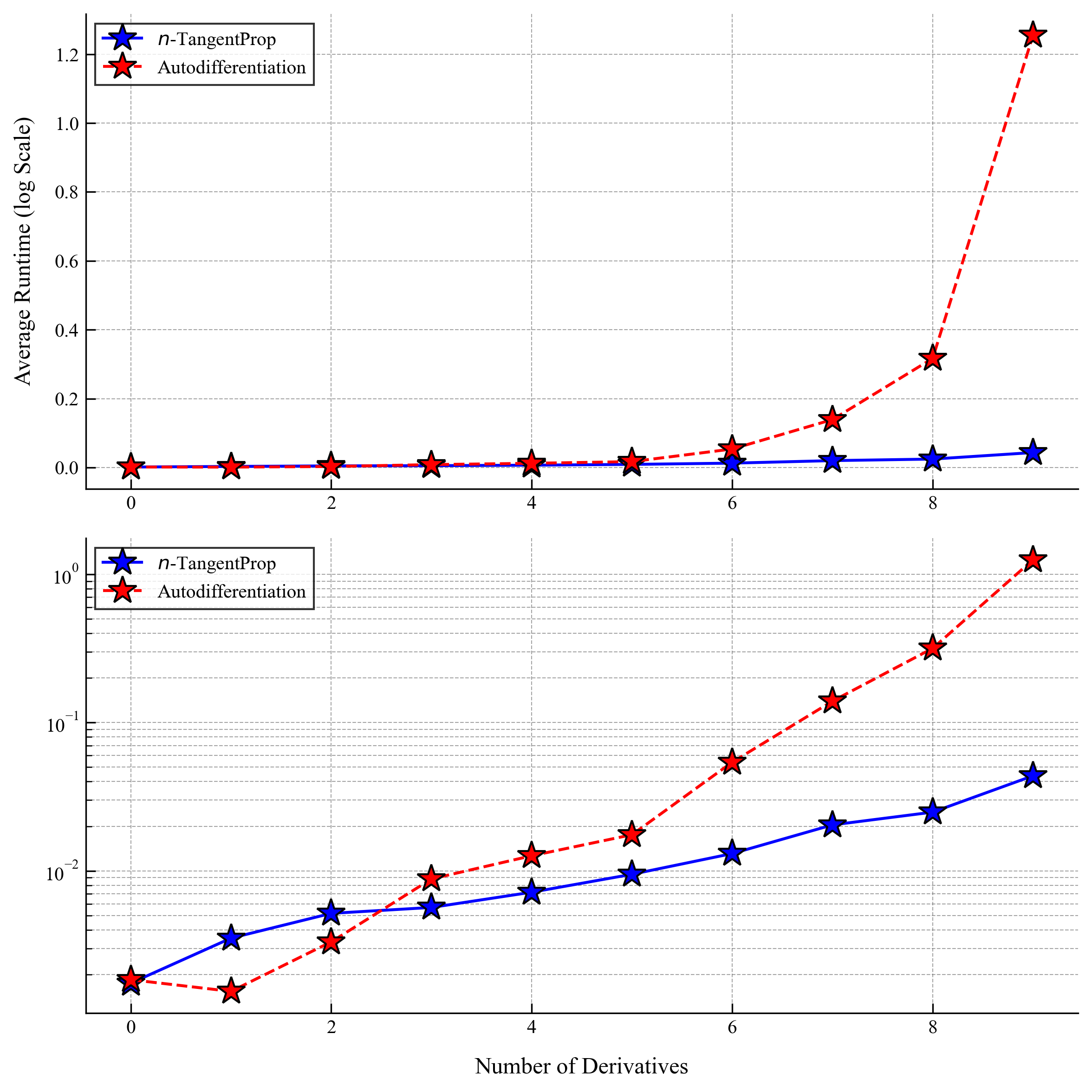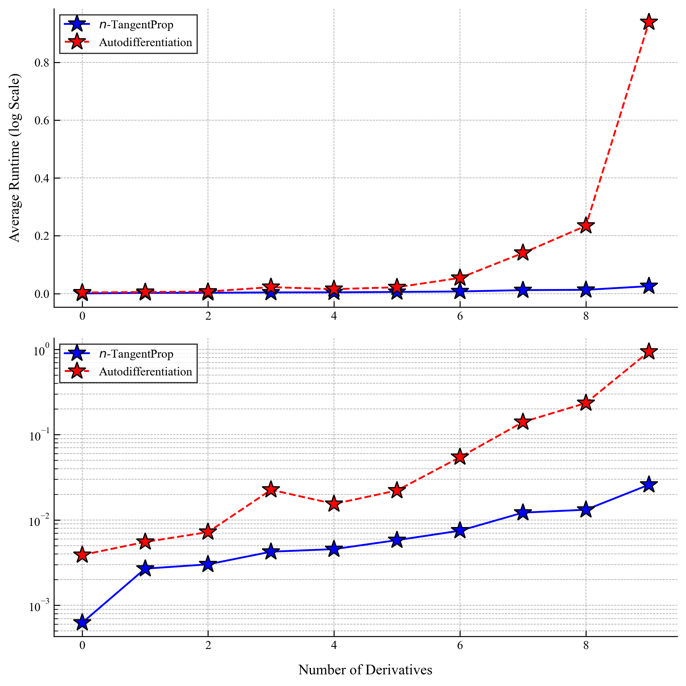 autodifferentiation (red) and -TangentProp (blue). The top and bottom frames show the same data, however the bottom frame is plotted with a logarithmic -axis. Each model is run 100 times and the average for each trial is plotted. The network has 3 hidden layers of 24 neurons each, a common PINN architecture. The batch size is samples.
