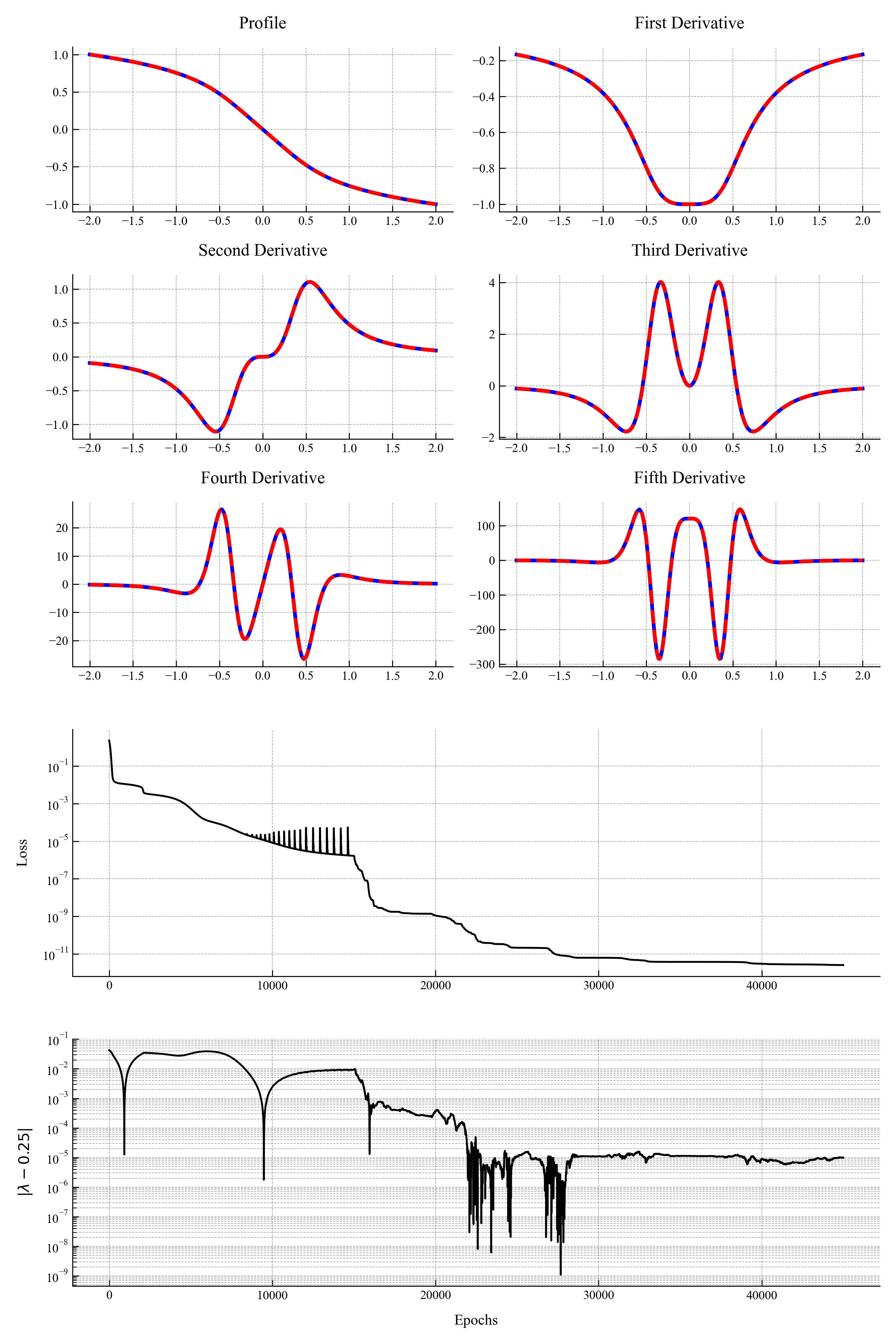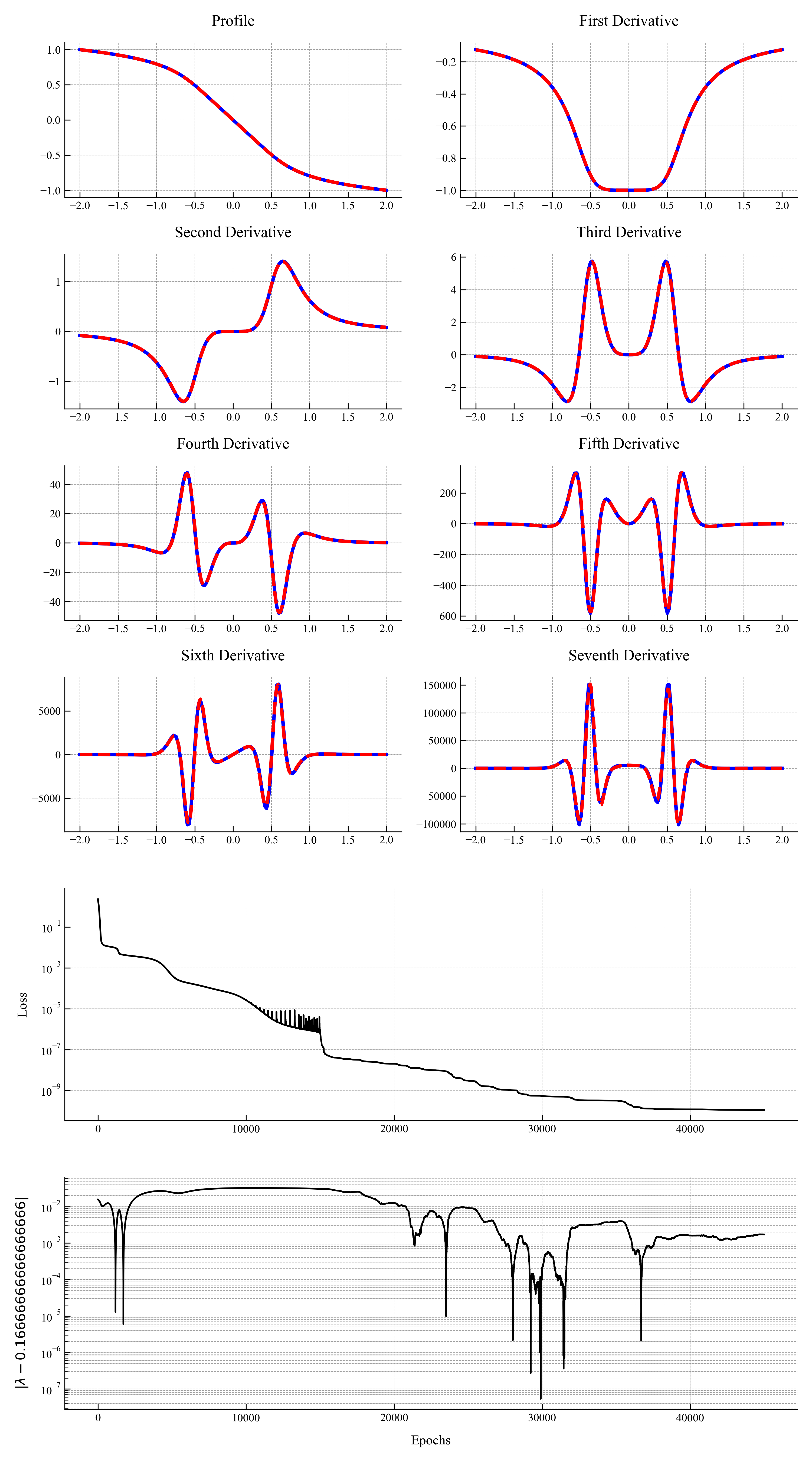 - Enabling new avenues of study which require taking high-order derivatives of PINNs. In particular we can easily enforce smoothness and thus compute previously unknown unstable self-similar solutions.