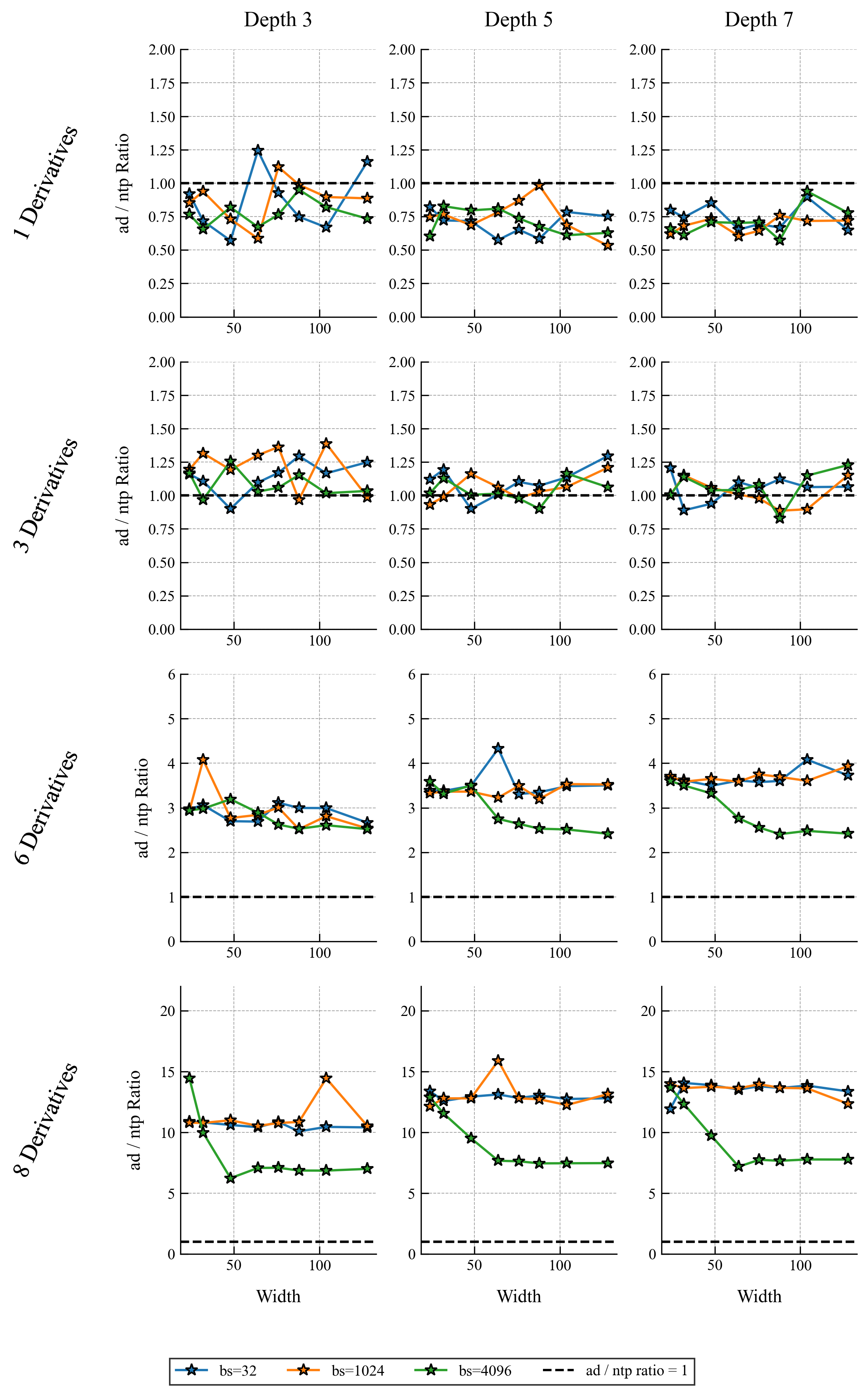 This root-exponential dependence on cannot be avoided by any differentiation algorithm, it is an unavoidable consequence of differentiation through function composition, which necessarily requires Faà di Bruno’s formula. Note than the the more exact runtimes for autodiff and -TangentProp are
