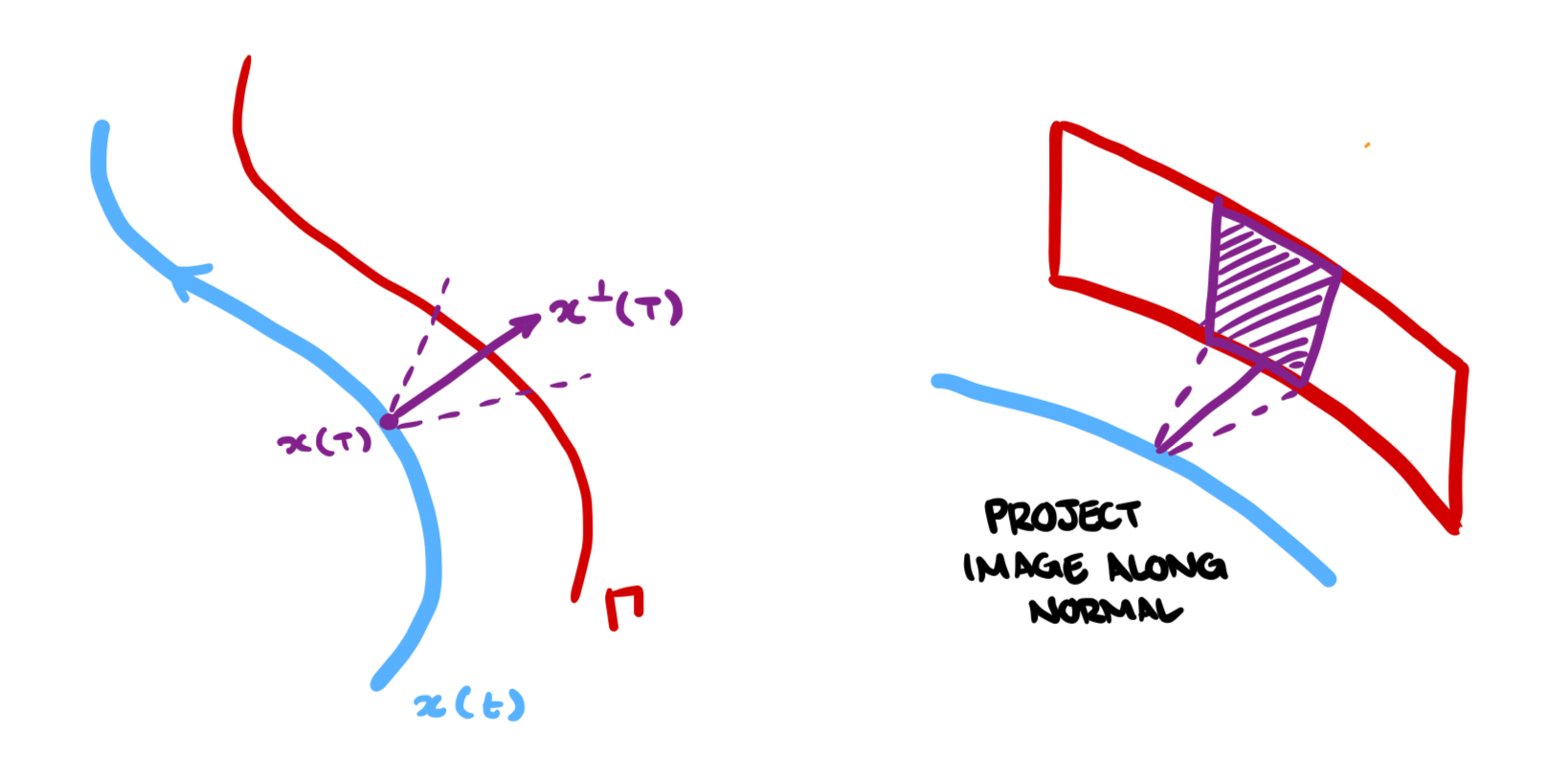 Since the camera is fixed in place to the ATV, and we assume that the ATV itself is rigid, the photos are taken with a fixed angle relative to the normal vector of the trajectory, denoted . Furthermore, we can imagine that the vines trace out a continuous curve through , and therefore at each time , should intersect . Thus, we can “project” the images and the associated bounding box info onto the sheet generated by extending in the -axis (see below).