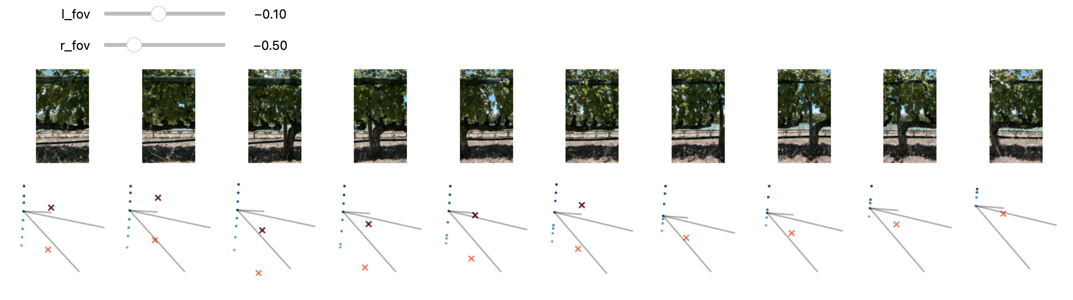 The first difficulty we have is determining the FOV of the camera, which we need to be able to determine where to project the objects. To do this I built another widget which allows me to adjust the FOV lines relative to the normal, given images of the vines. By correlating the images, FOV lines, normals, and geo-location data I was able to extract the camera FOV relatively easily