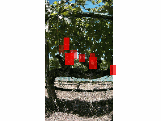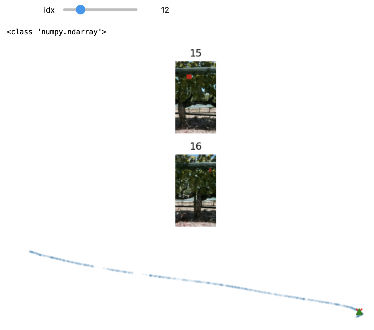 A perusal of the data quickly reveals that the vehicle is moving North-West, taking photos to its right. This is best observed by plotting the geo-location data through time. On the left we have plotted the image locations and the vine locations increasing in darkness over time. On the right we have plotted the (very downsampled) images as a gif showing roughly what the computer “sees”, which is the images and the bounding boxes.