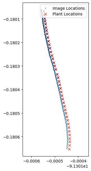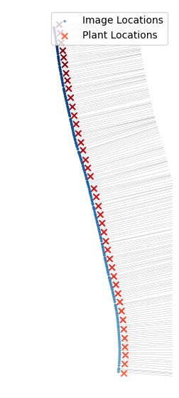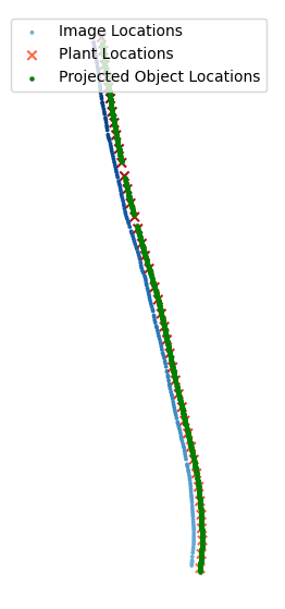 Below is an image of the image locations, plant locations, and the projected object locations. We see that my procedure projects the objects onto the plane formed by connecting the vine locations with lines.